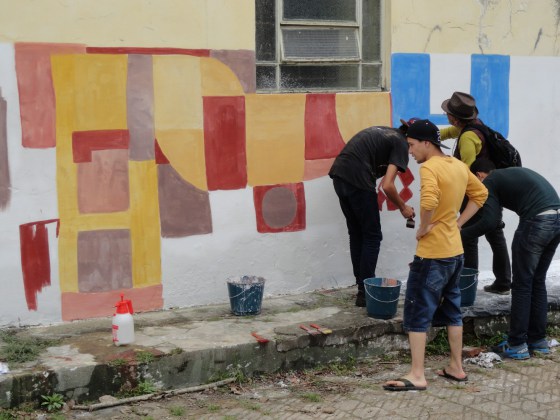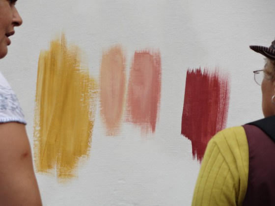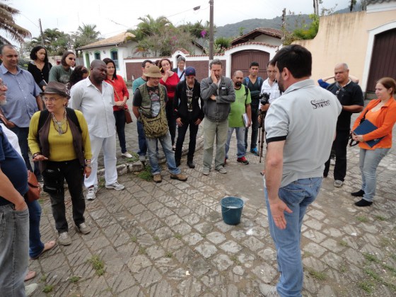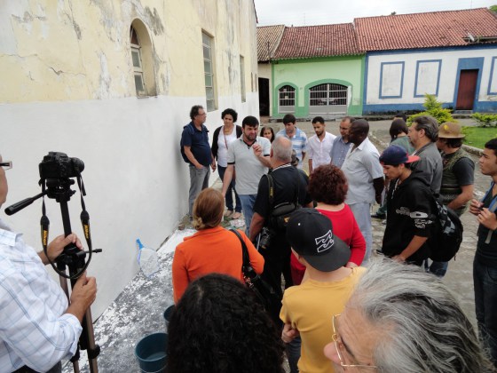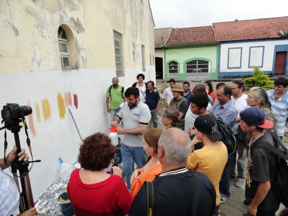 A seguir, os participantes seguiram para a Igreja de São Benedito, que já tinha a sua parede do fundo preparada para que individualmente fosse testada uma paleta de cores, bem como, as técnicas de proporção e mistura da cal com os corantes, exemplos de sua empregabilidade, processos de tratamento e “cura” .